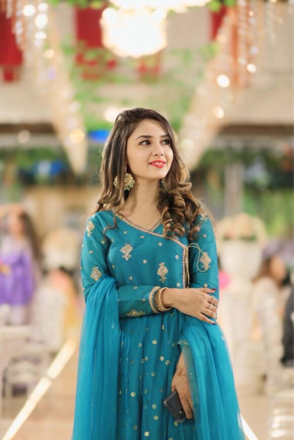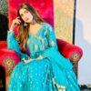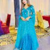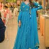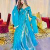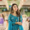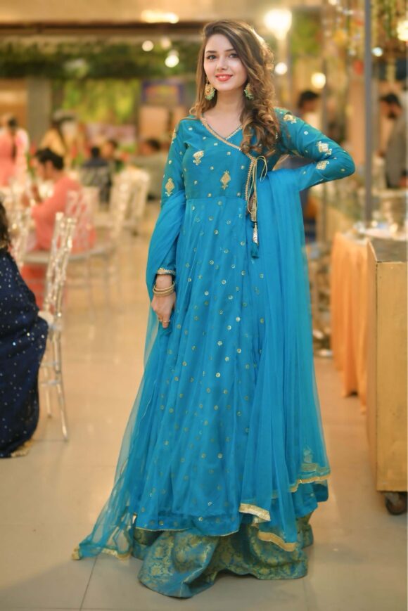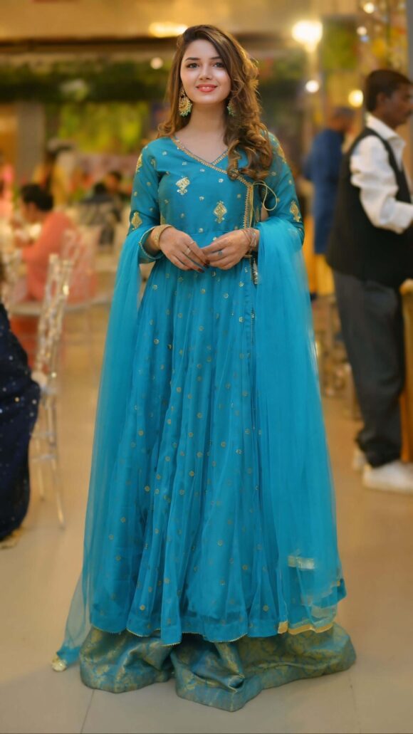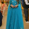 This teal Anarkali dress is a beautiful and elegant outfit, perfect for weddings, parties, or any special occasion. It is made from soft silk fabric and decorated with golden embroidery and shiny sequins that give it a lovely festive look.