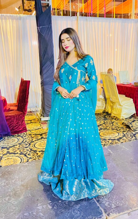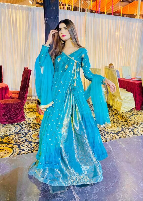 The dress has a stylish V-shaped neckline and full sleeves. It flows beautifully and feels very comfortable to wear. Under the Anarkali, there is a matching brocade lehenga skirt that adds extra flair and makes the dress look even more graceful.