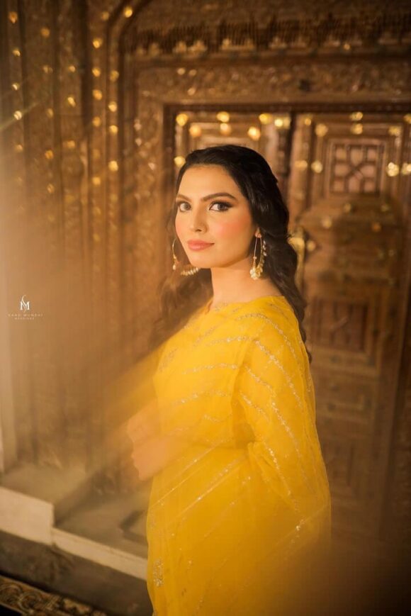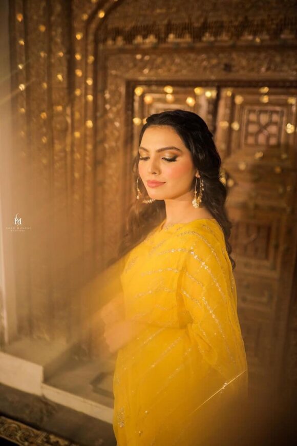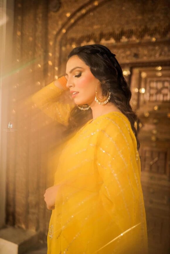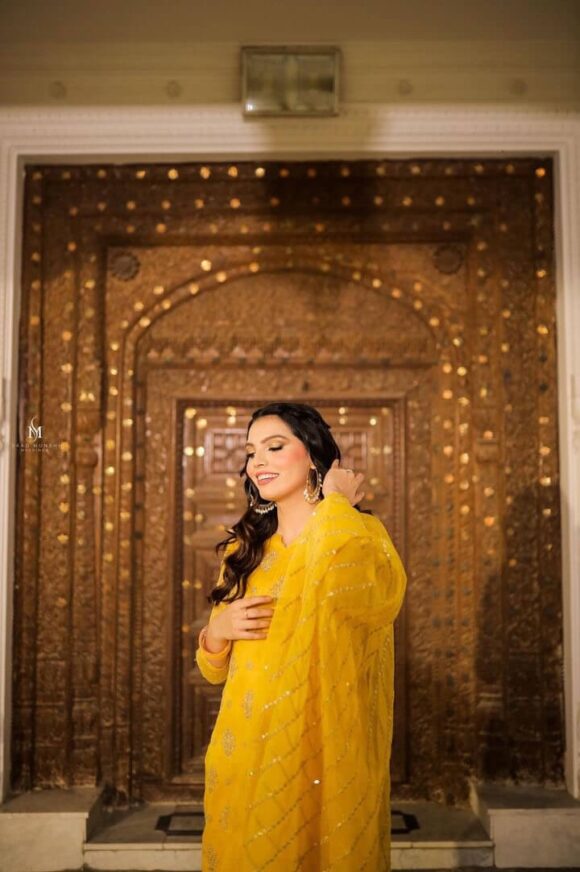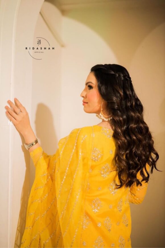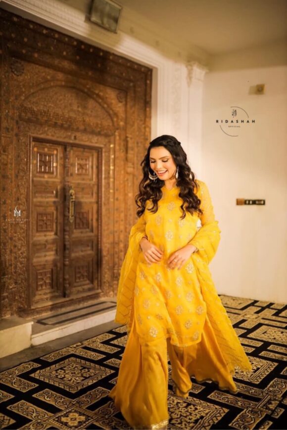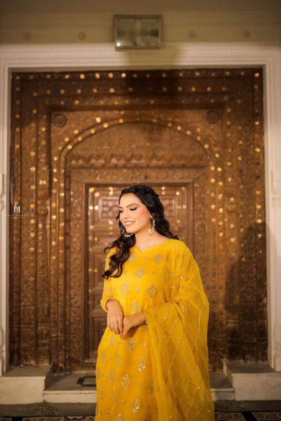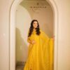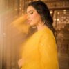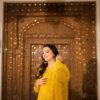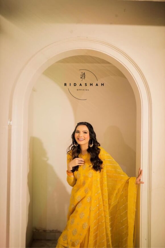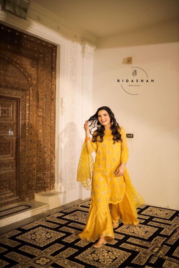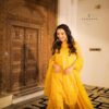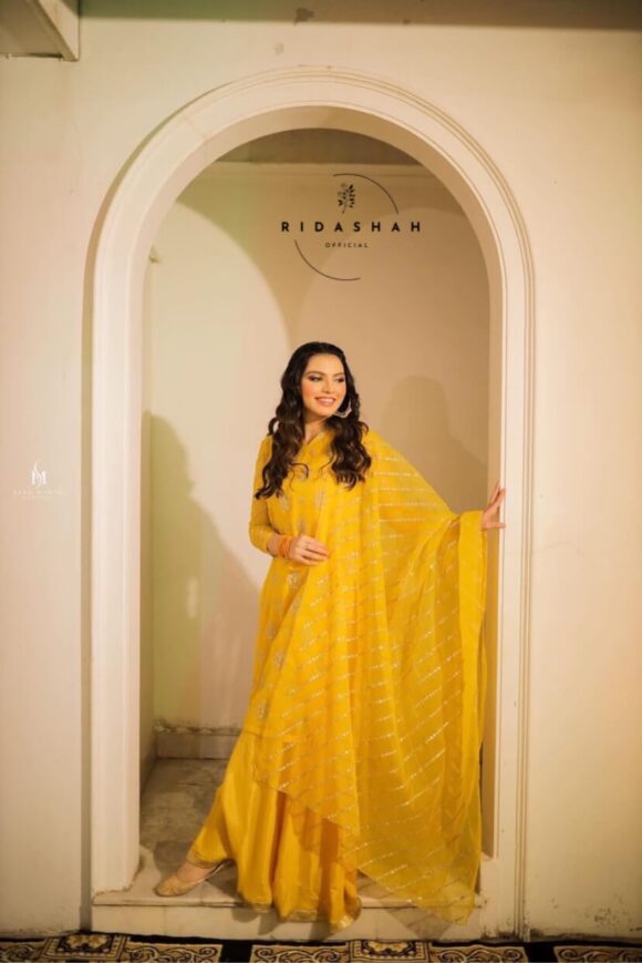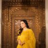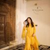 Celebrate your mayun with elegance and color in “Mayu Ka Jora”, a stunning yellow gharara set designed to bring tradition and style together. Crafted from luxurious organza, the shirt features intricate silver embroidery that shines with every step. Paired with a flared silk gharara and a delicately embroidered organza dupatta, this outfit is your perfect pick for pre-wedding festivities.