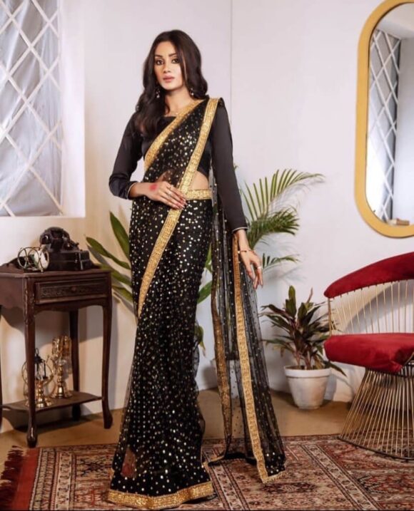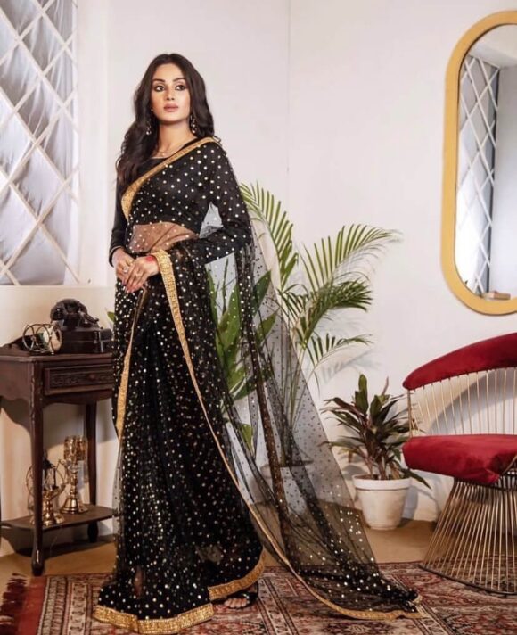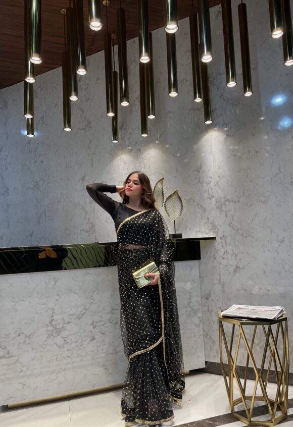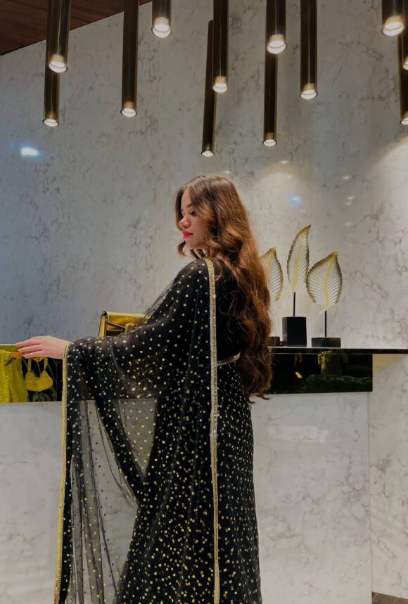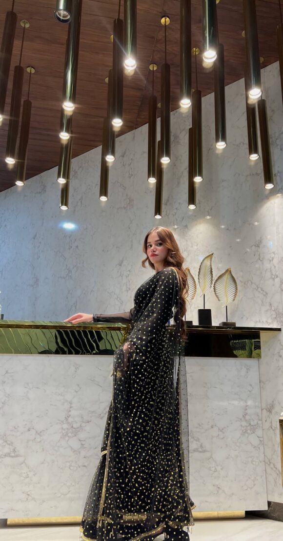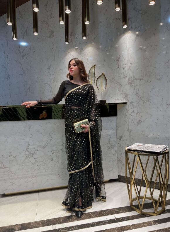 Step into timeless elegance with our “Midnight Sparkle” Black Net Saree, a perfect blend of classic glamour and modern sophistication. Crafted with premium soft net fabric, this saree features gold polka detailing all over, delicately embellished for that graceful shimmer with every step you take.