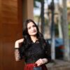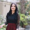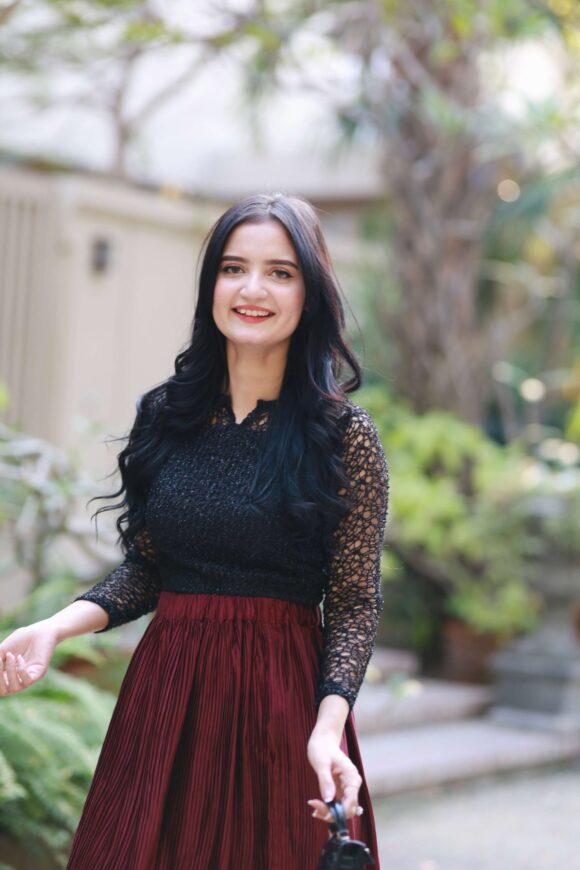 • Top: A jet black, delicately hand-embellished lace blouse with full sleeves and scalloped edges. The fitted silhouette flatters your shape while offering refined sophistication.