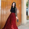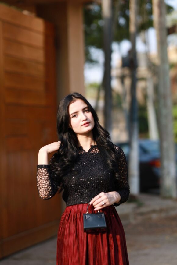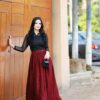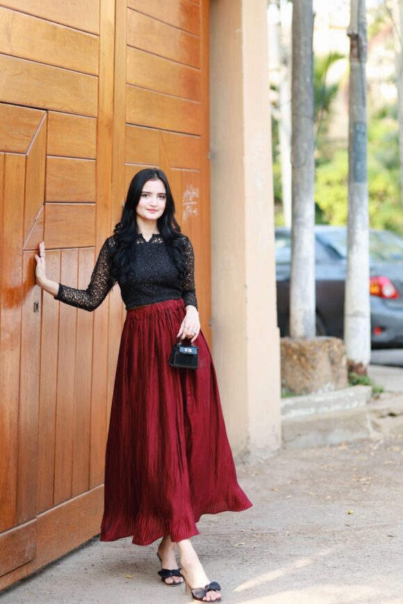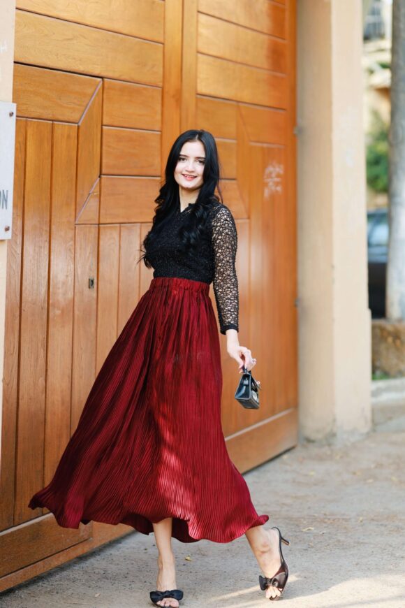 • Skirt: A deep wine-red pleated maxi skirt crafted from luxe flowy fabric that adds graceful movement and a regal charm to every step.