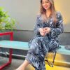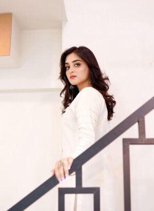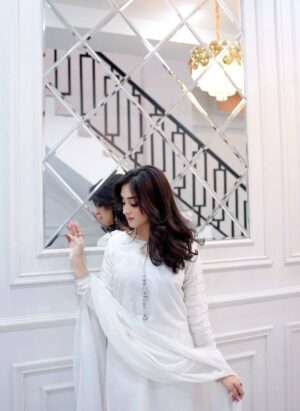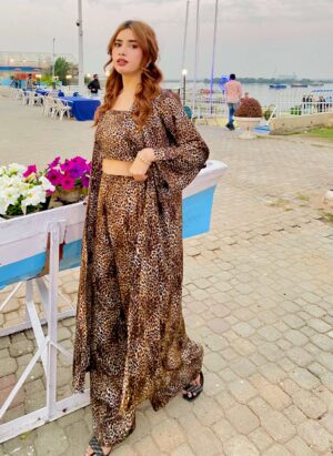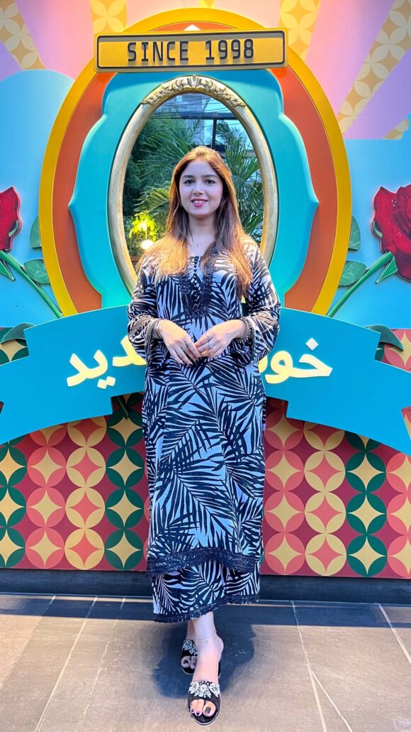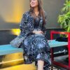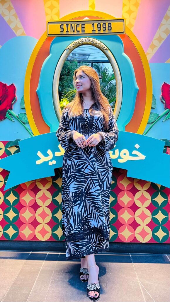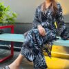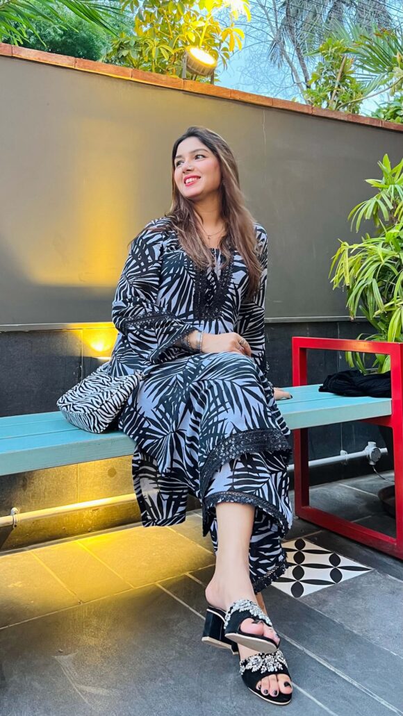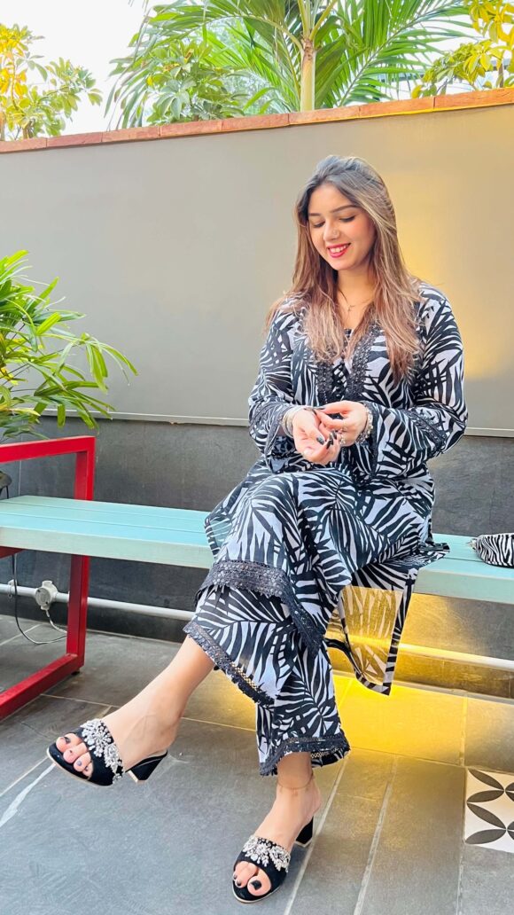 Step out in style with our striking black and white palm-leaf printed co-ord set – a perfect blend of contemporary cut and effortless grace. Crafted from soft, breathable lawn fabric, this outfit features a loose-fit kurta with lace detailing on the sleeves and hem, paired with matching culottes for a coordinated and comfy silhouette.