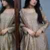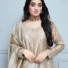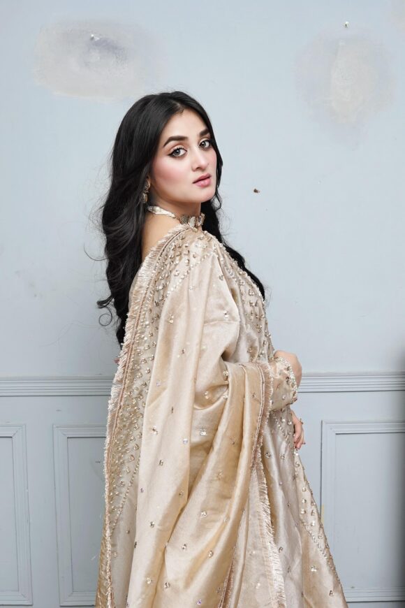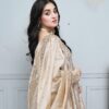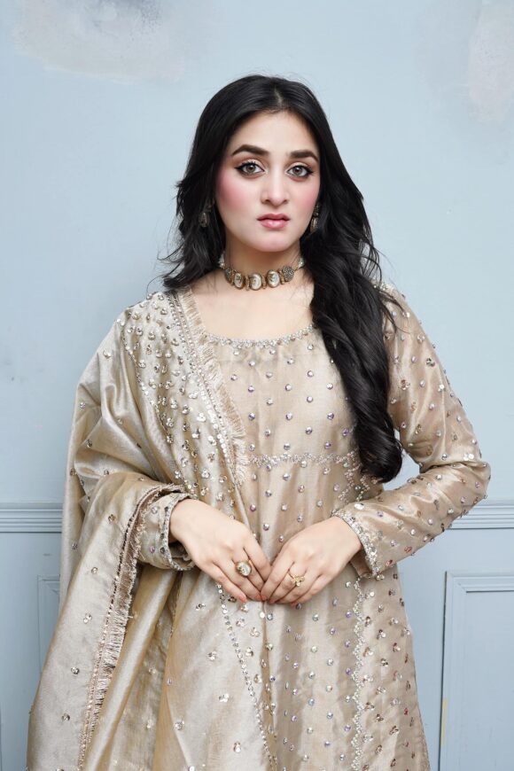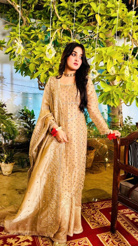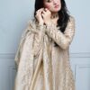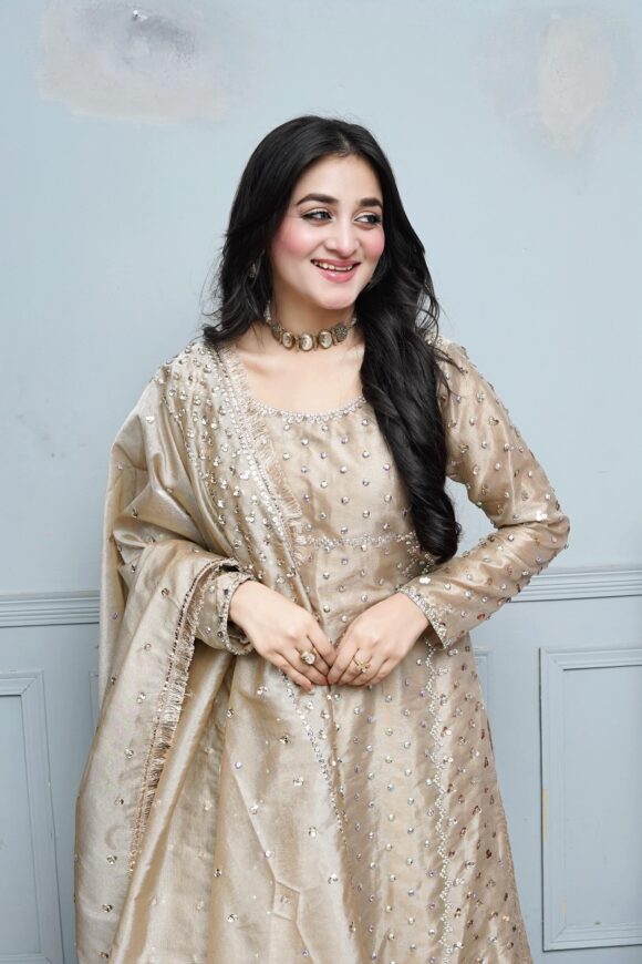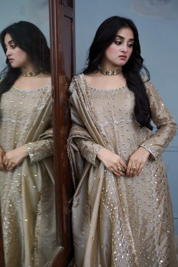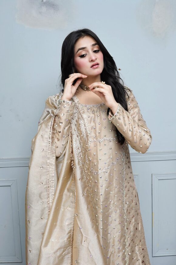 Step into your forever moment in Noor-e-Nikah, a timelessly elegant champagne gold outfit crafted exclusively for the most sacred occasion of your life. This piece captures the essence of ethereal bridal charm with soft hues, intricate embellishments, and a luxurious silhouette.