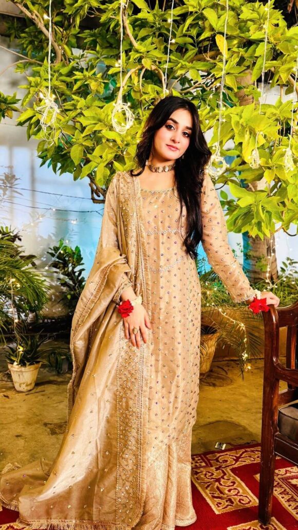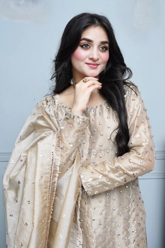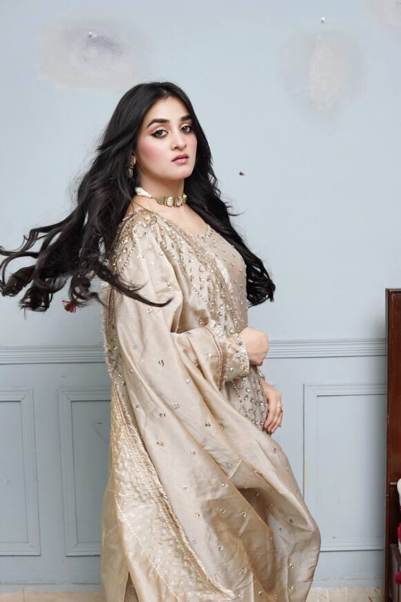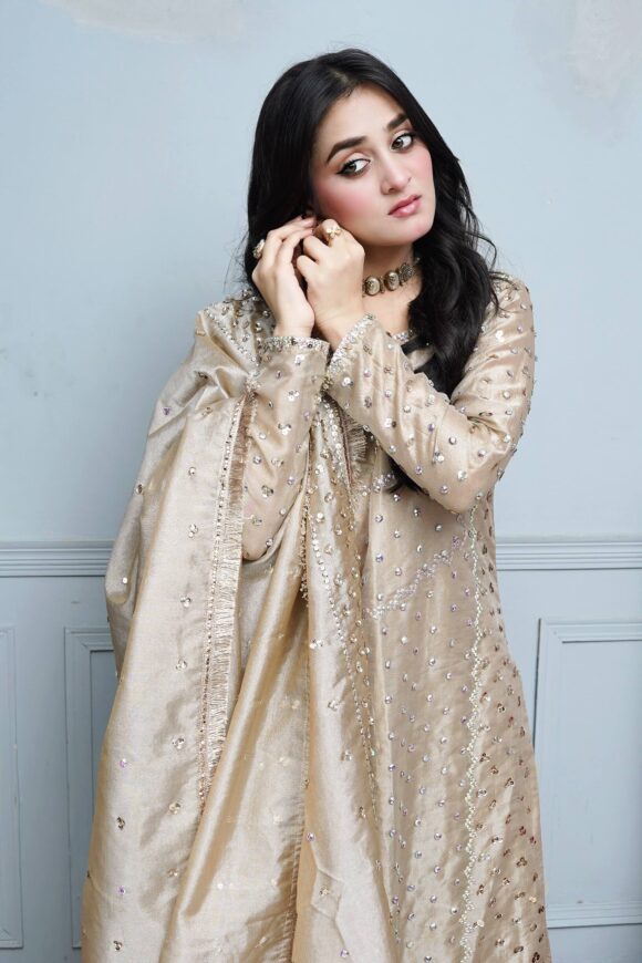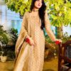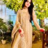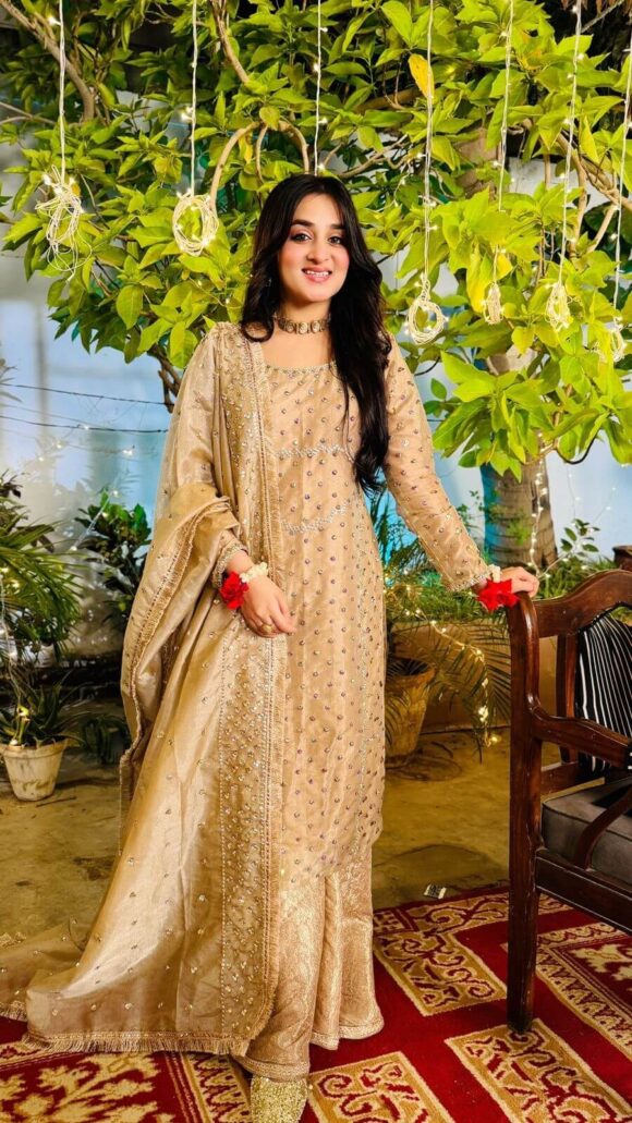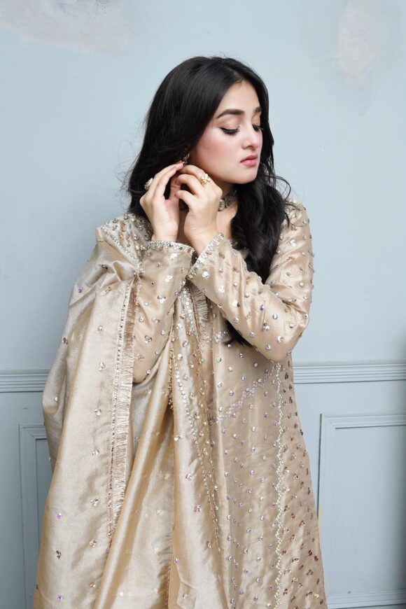 Step into your forever moment in Noor-e-Nikah, a timelessly elegant champagne gold outfit crafted exclusively for the most sacred occasion of your life. This piece captures the essence of ethereal bridal charm with soft hues, intricate embellishments, and a luxurious silhouette.