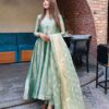 Crafted from high-quality Lame Tissue, this outfit glows with a luminous mint green hue, casting a soft sheen that makes every movement magical. The structured angrakha cut, paired with a gracefully flared pishwas, brings a regal aura to your Eid look.