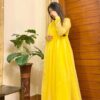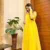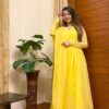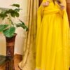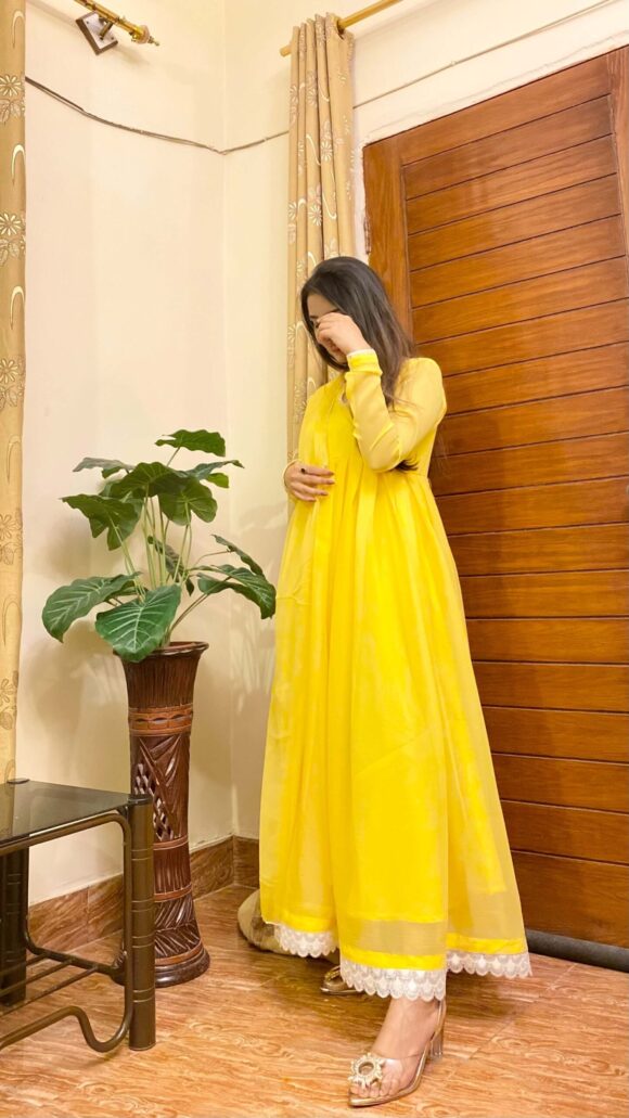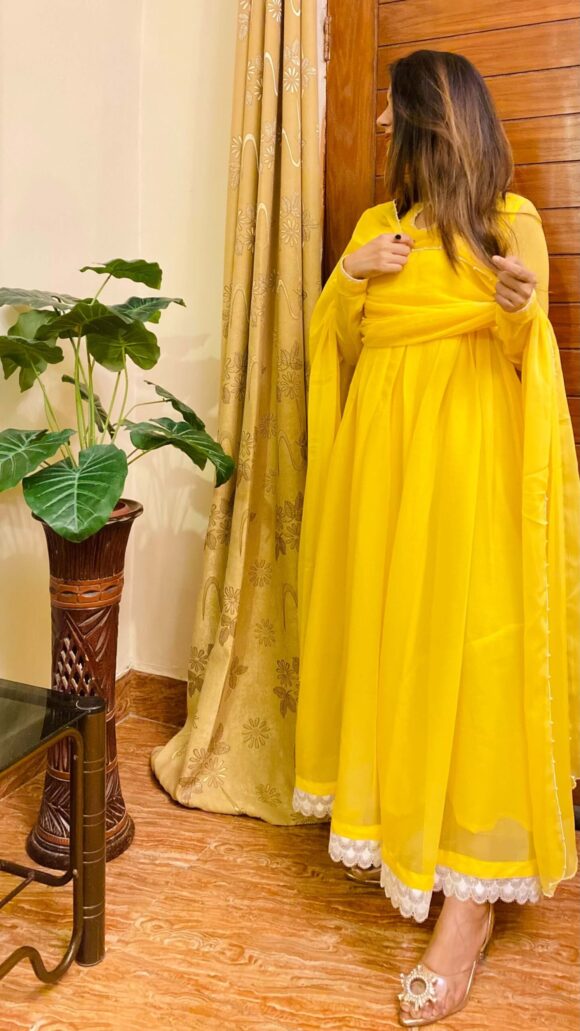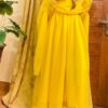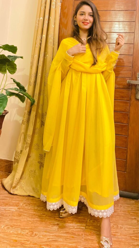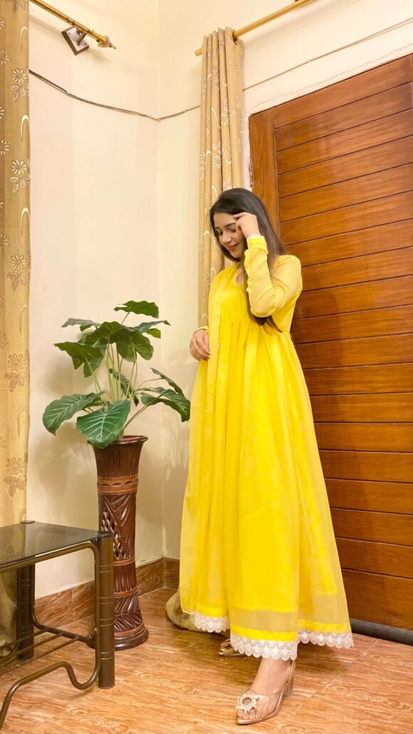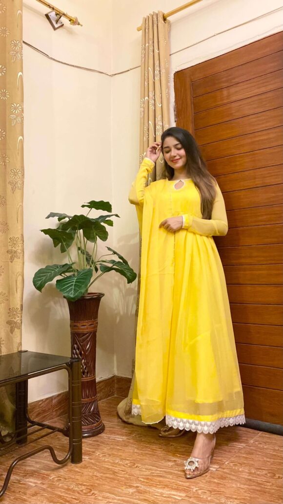 Introducing Ruba – a soft, sun-kissed ensemble that captures the essence of daytime elegance. This bright yellow frock is adorned with delicate white lace detailing on the sleeves and hem, adding a touch of sophistication and charm. Paired with tailored cigarette pants and a flowy chiffon dupatta, Ruba is perfect for Eid, festive brunches, or a graceful everyday glam look.
